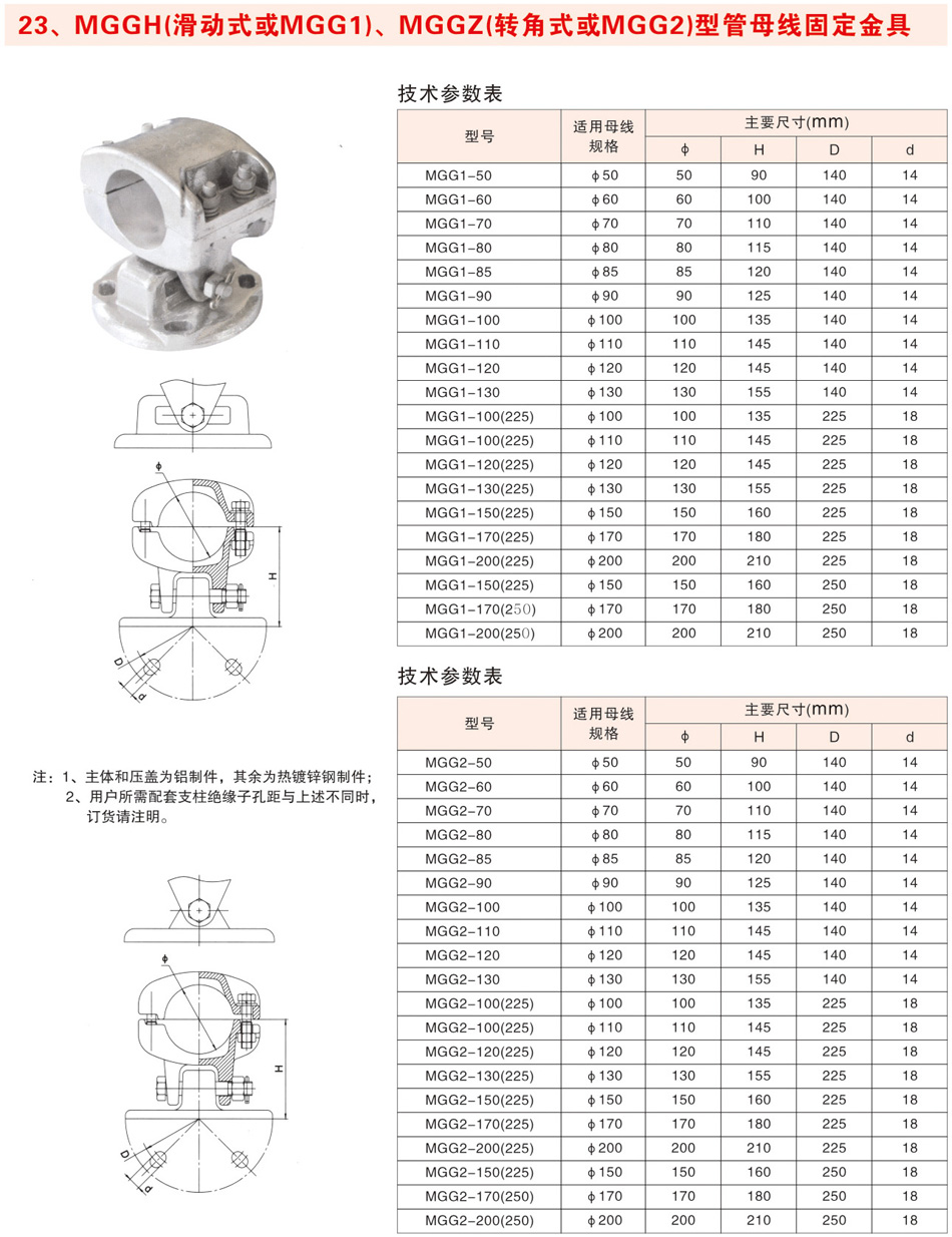 MGGH(滑动式或MGG1)、MGGZ(转角式或MGG2)型管母线固定金具