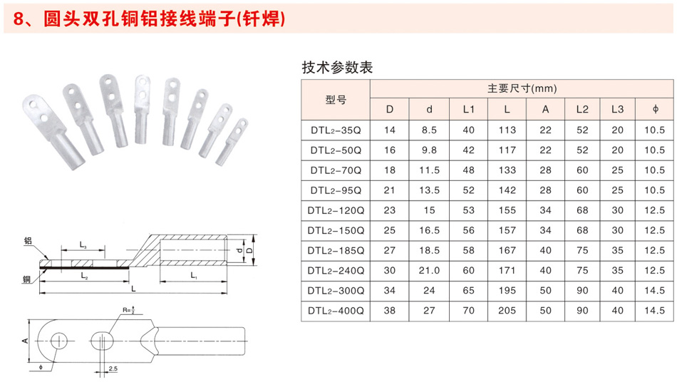 圆头双孔铜铝接线端子(钎焊)